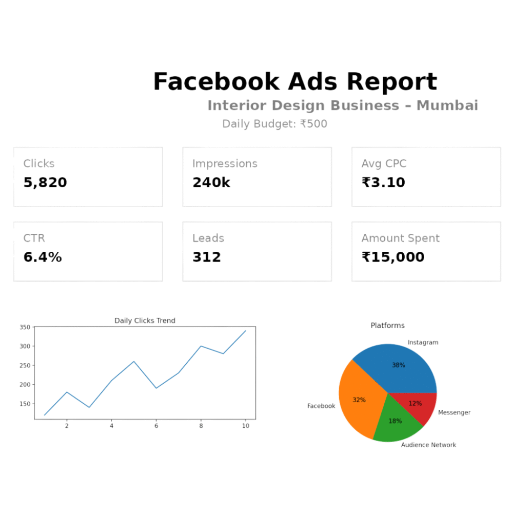 A lead-focused Facebook Ads campaign for an interior design business in Mumbai, achieving 6.4% CTR, scalable lead volume, and cost-efficient performance across Facebook and Instagram placements.
