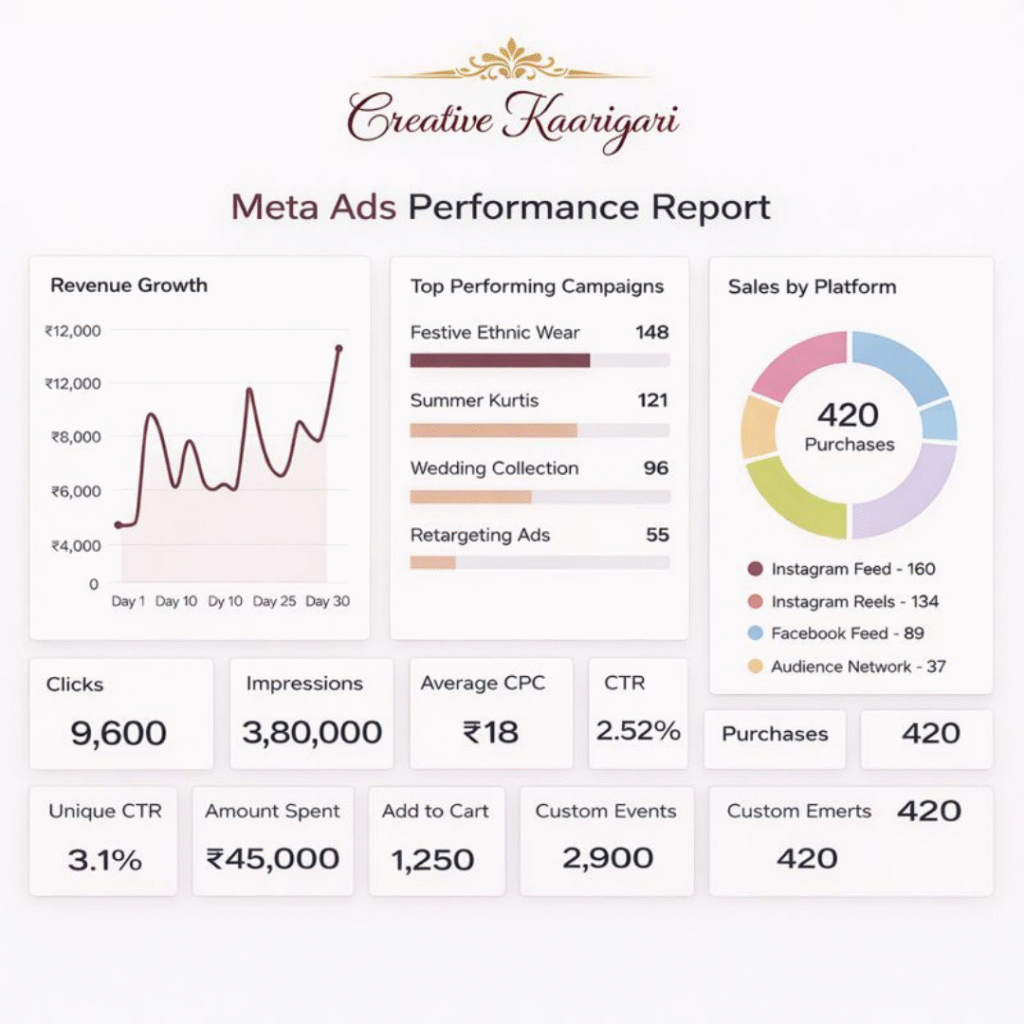 An e-commerce Meta Ads strategy for Creative Kaarigari that drove 420 purchases, high engagement, and consistent revenue growth through festive collections, retargeting ads, and multi-platform optimization.