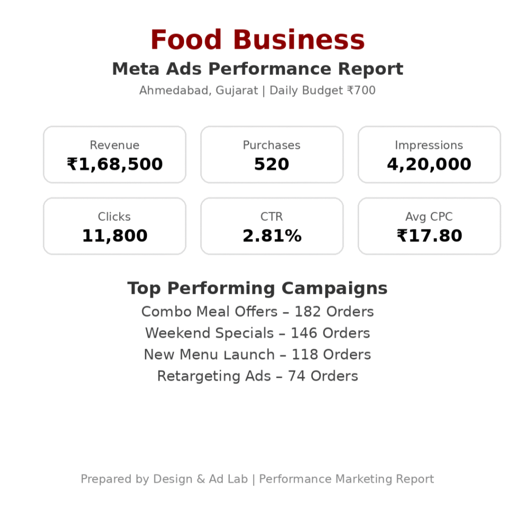 A high-performing Meta Ads campaign for a food business in Ahmedabad that delivered 520 purchases, strong CTR, and consistent daily orders by promoting combo meals, weekend offers, and retargeting audiences.